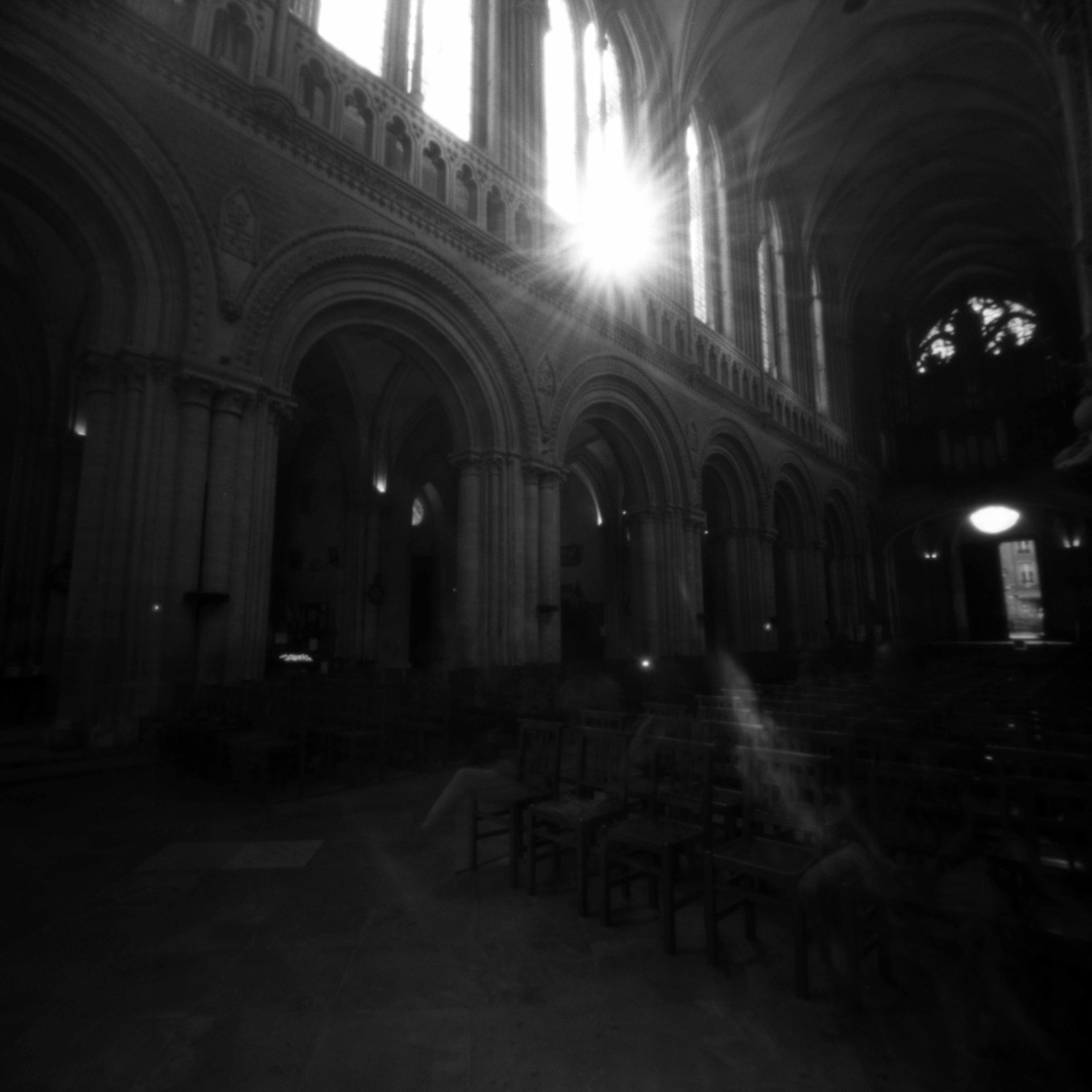 Comme à mon habitude, j’ai poussé ma pratique de la photographie dans ses retranchements, sténopé, pellicule argentique rapide, temps de pose au jugé de 10 à 15 mm, obligeant la lumière à entrer de force, de face, dans mon appareil en bois.